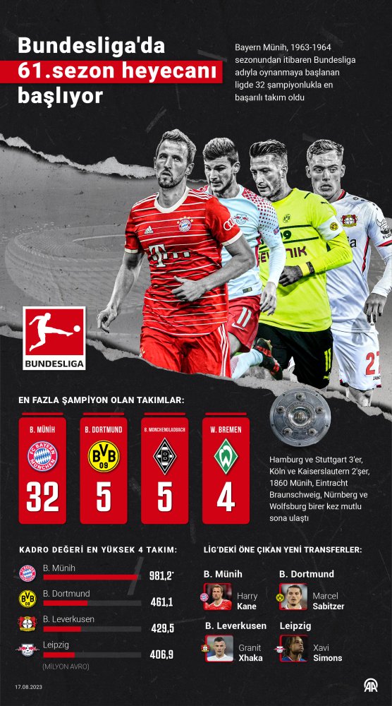 Avrupa futbolunun 5 büyük ülkesinden biri olarak kabul edilen Almanya’da 2023-2024 sezonunun açılış maçında son şampiyon Bayern Münih, Werder Bremen’e konuk olacak. Mücadele, TSİ 21.30’da Weser Stadı’nda oynanacak.